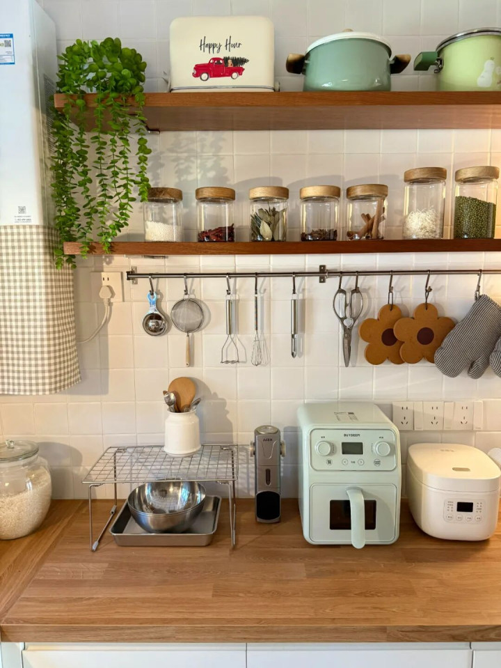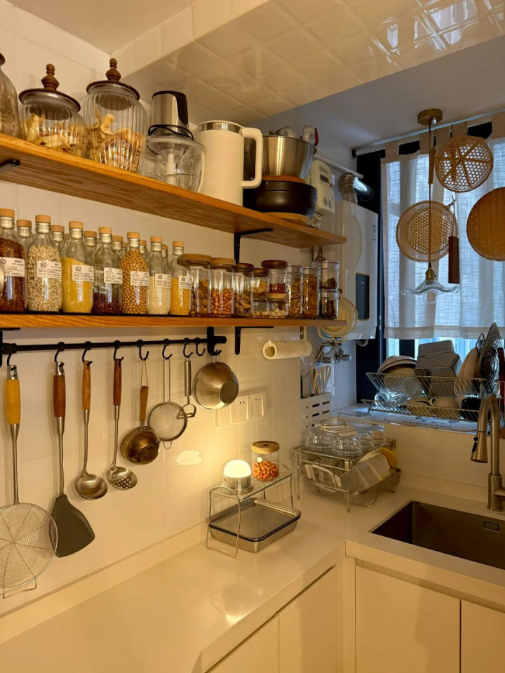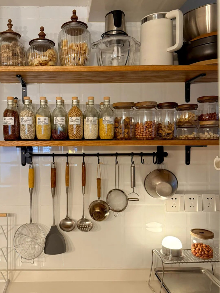像网友@半斤 家里,装了两层开放式置物隔板,颜值高不说,常用调料、杯子、干货罐子摆上去,随手拿取特别顺手,不用再踮脚够吊柜里的物品。
