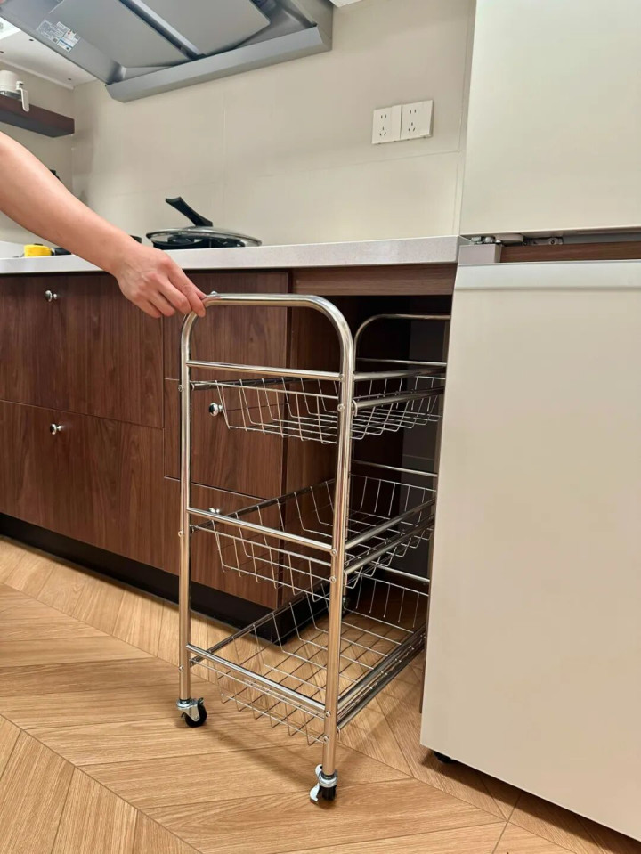 其实只要在厨房留个小空位,放辆可移动小推车就行,哪里需要推哪里。刚买的青菜、萝卜不用往台面上堆,直接码进小推车里,台面瞬间清爽不少。
