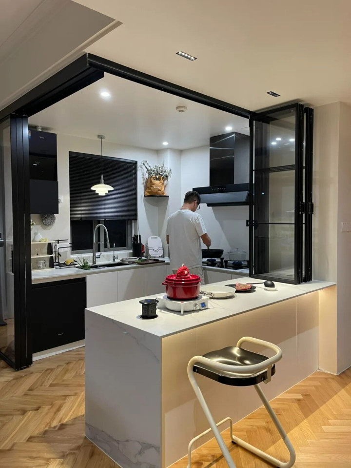 像网友@熊猫先森 家,他就一直认为吊柜太不实用,太高拿东西也不方便,而且看着压抑,影响煮饭的心情,所以,他设计了一个吧台,吧台底下空间能塞进一头猪,所以,厨房储物完全没问题。