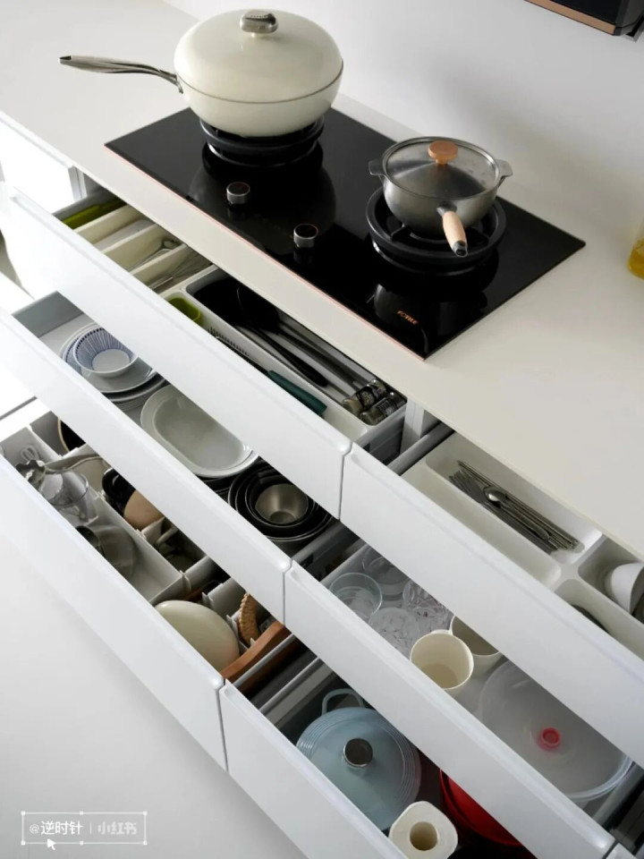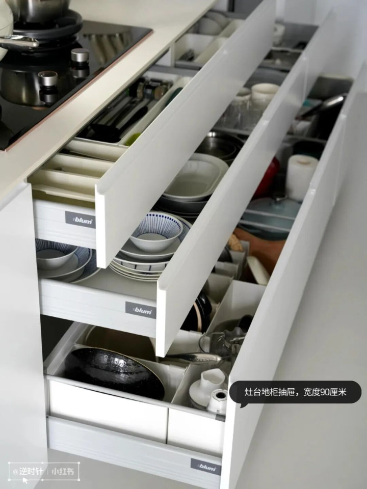 最上层用来放筷子、勺子这类小餐具,中间层收纳碗碟盘子,最下层收常用的锅具,抽屉拉出来一目了然,再也不用蹲地上掏柜子翻找。