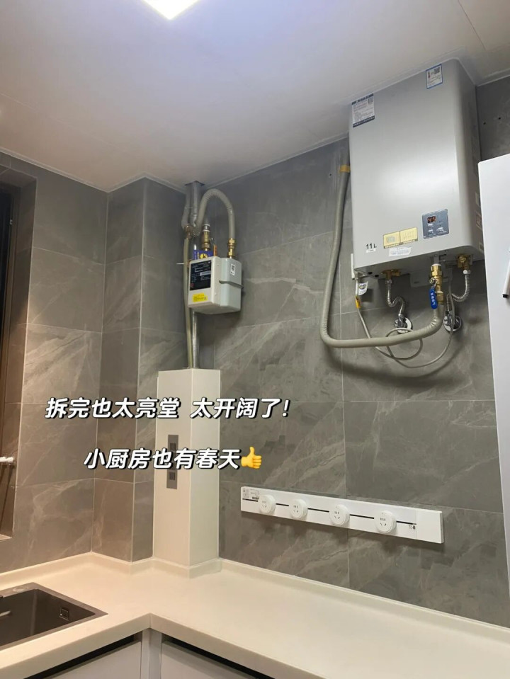 她家刚开始做了两个吊柜遮挡热水器和燃气,但是装完以后发现难用又压抑,于是决定还是把柜子拆了。拆了后,空间真舒服,光线瞬间也亮堂了。