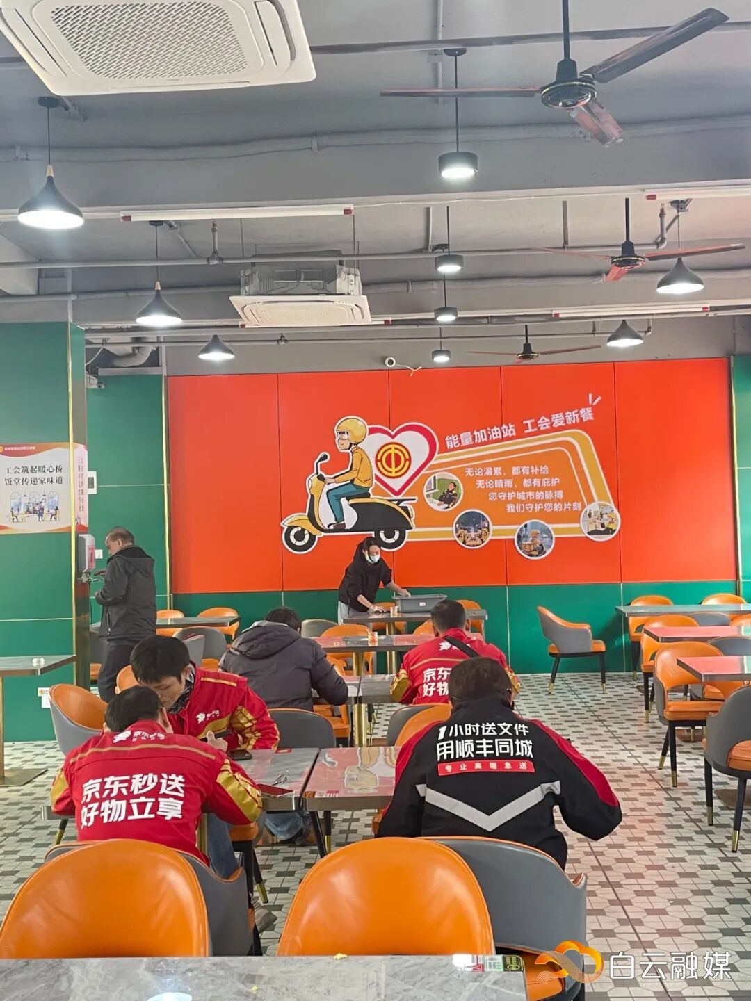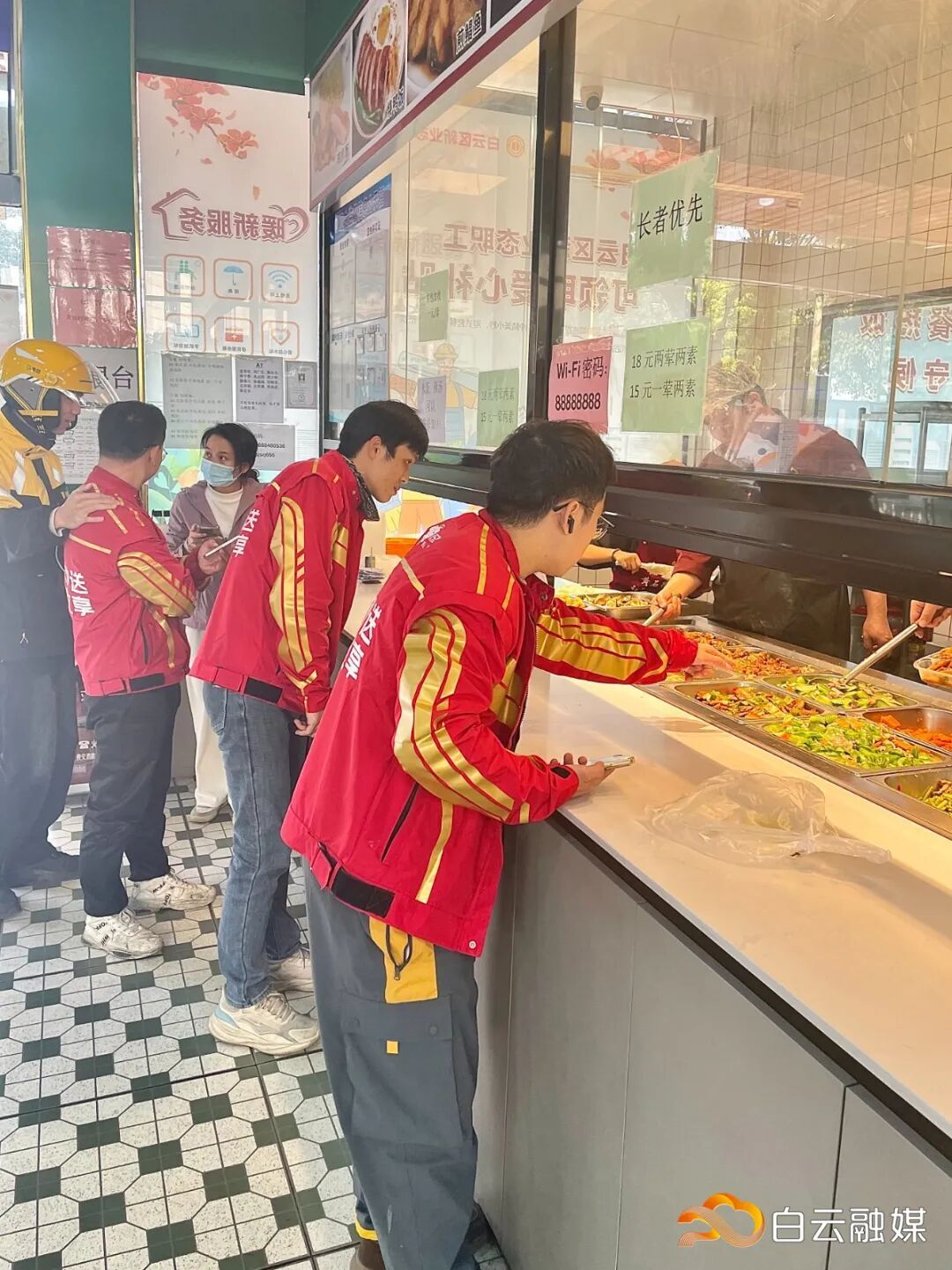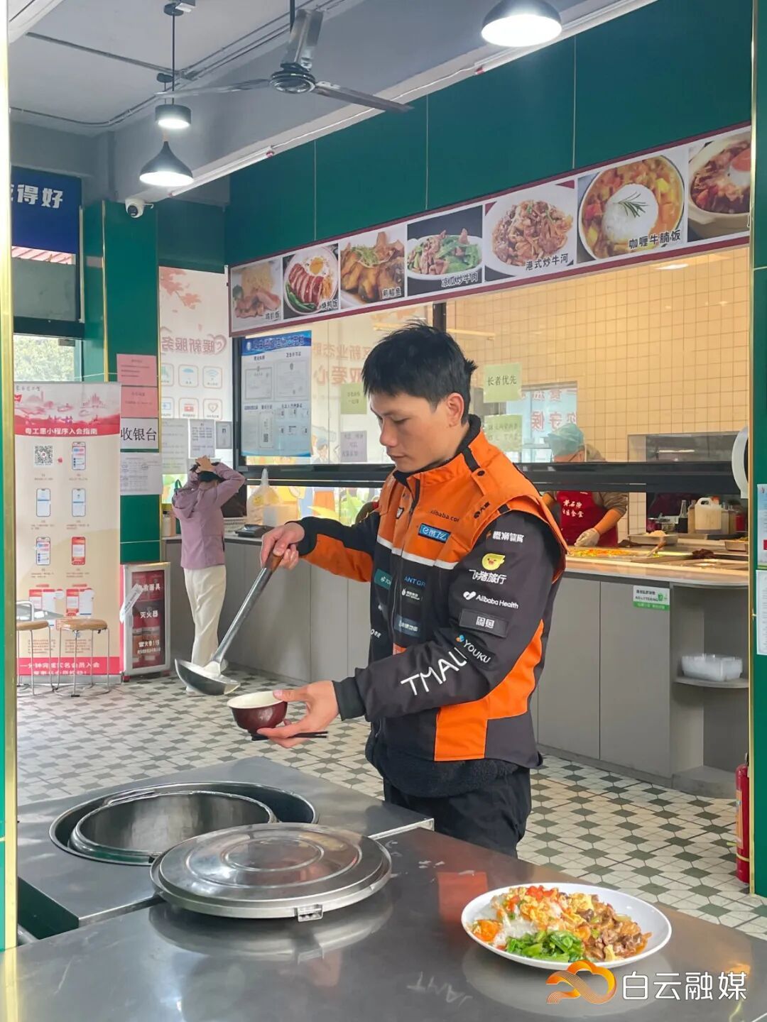 美团小哥阿健:“没有这个饭堂的时候,我们都是跑到哪里就在哪里吃,坐在车上吃,随便对付一口,现在这个饭堂开了,可以正经坐下来吃一顿饭,冬天也能吃到热乎乎的饭菜,不仅价格便宜,味道还不错。”